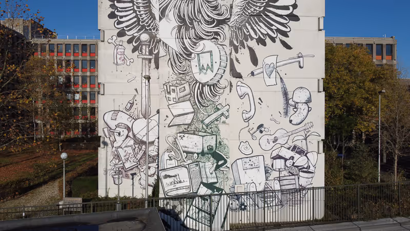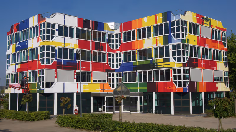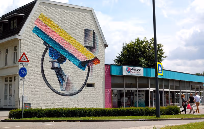 Grootste mural van Nederland (750m²) door Zedz. Ode aan 100 jaar De Stijl met geometrische patronen. Artiest: Zedz (Ronald van der Voet) uit Leiden, woont in Milaan. Winnaar Dutch Street Art Award 2017.